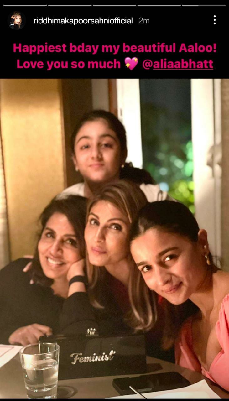 Ranbir Kapoor's sister, Riddhima Kapoor Sahni too took to her IG stories and wished her future bhabhi, Alia Bhatt on her birthday. Riddhima shared a throwback picture in which Alia was seen having family time with Neetu, Riddhima and the latter's daughter, Samara Sahni. Sharing the cute picture, Riddhima wished Alia and called her with a special name. Riddhima wrote in the caption: