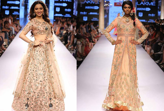 The first look, flaunted by actress Tamannaah Bhatia, is from designers Anaiikka and Payal Singhal's show. The second look is from ace designer, Suneet Varma's show. Both the lehengas are in a shade of very understated peach and beautifully complement the floral embroidery. Needless to say, if you want to make a minimal statement then this is the kind of look you might want to go for. Try this out, it could well be just the perfect look for you!