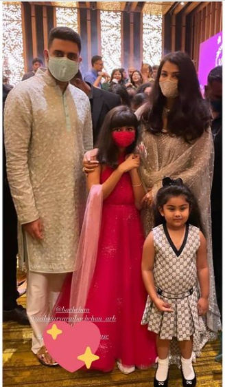 A few days back, Aishwarya Rai Bachchan had attended her cousin, Shloka Shetty’s wedding with her hubby, Abhishek Bachchan and daughter, Aaradhya Bachchan. While scrolling through our social media handle, we had stumbled upon a lovely picture of the trio from one of the functions. Aishwarya had looked gorgeous as always in a champagne-coloured embellished suit with intricate detailing and teamed her look with a matching mask. Abhishek had complemented her in a champagne-coloured kurta and pyajama while Aaradhya had opted for a red Anarkali with a matching mask.