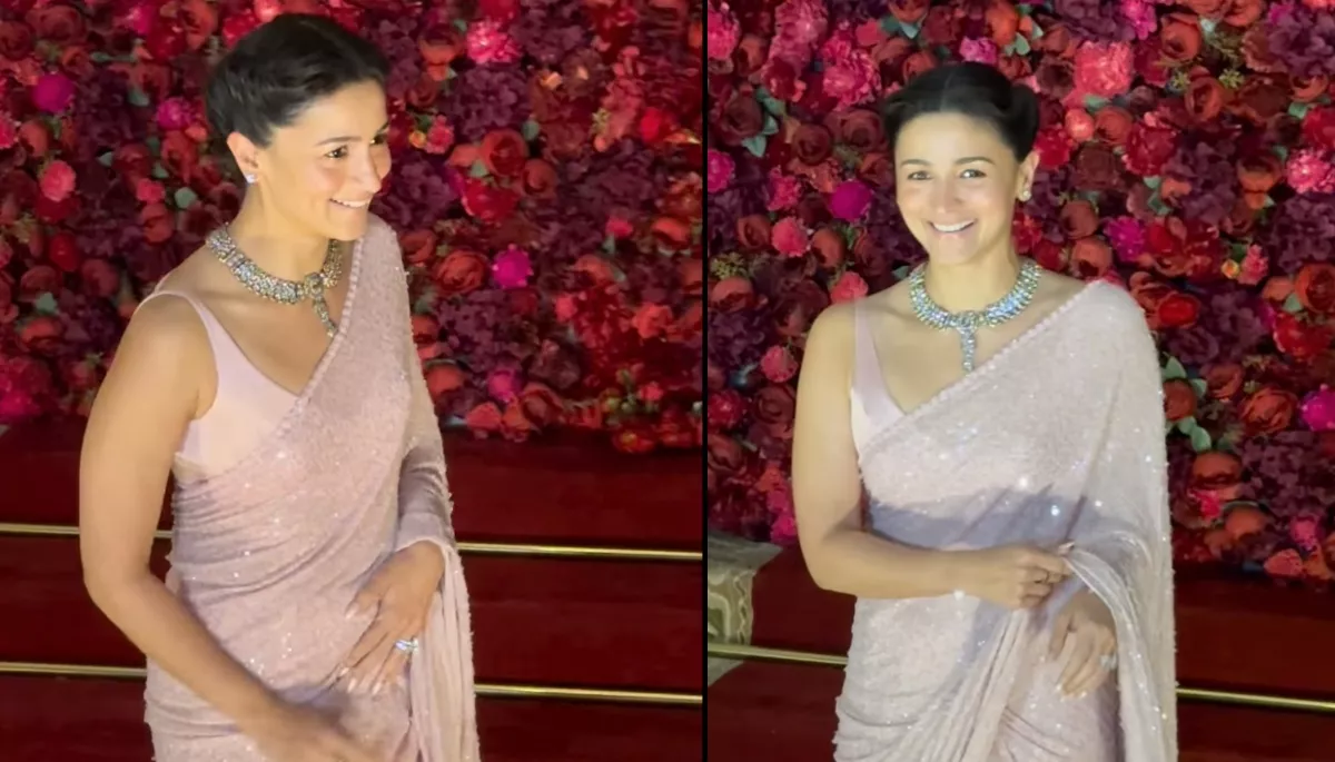 For every girl, it was the first wedding in her sasural that held a lot of memories. And Alia is feeling the same joy, as after her intimate wedding with Ranbir Kapoor, Aadar Jain's wedding is the first in the family. For the big day, Alia picked a baby pink sequinned saree. She draped it nicely with open pallu. She teamed it with a bralette-style blouse.