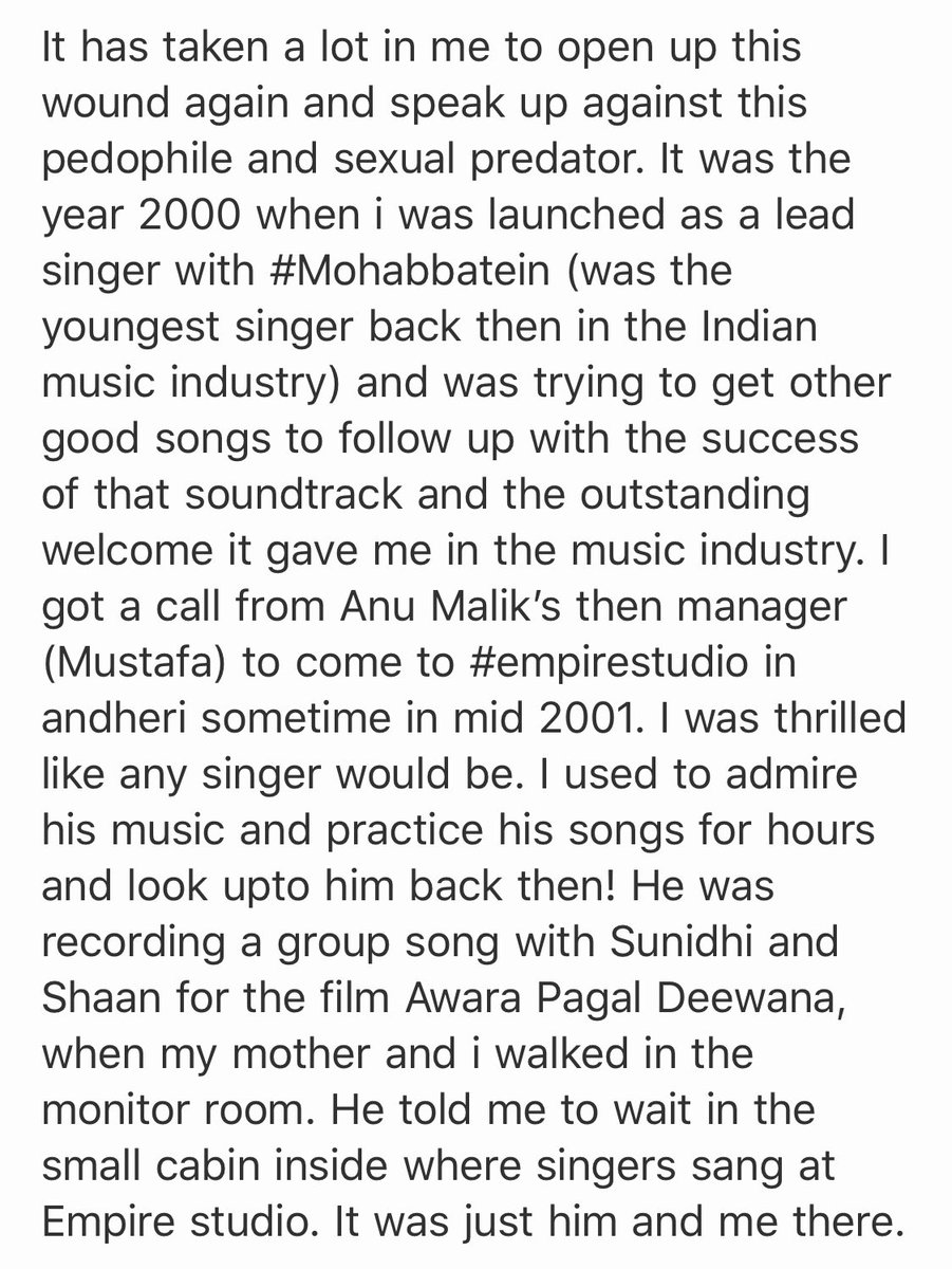 Another anonymous woman shared her experience with Anu Malik when she came for an audition in 1990 at Mehboob Studios. He rubbed himself against her and apologised. But things took a darker turn when they had to collaborate for a fund-raiser later. Reminiscing the time when she met him at his house, she recalled, "He sat next to me on the sofa. I realised I was trapped as his family was not at home. He then lifted my skirt and dropped his pants. I thought of pushing him and rushing out the door, but he was too strong for me. Luckily, the doorbell rang at that moment."