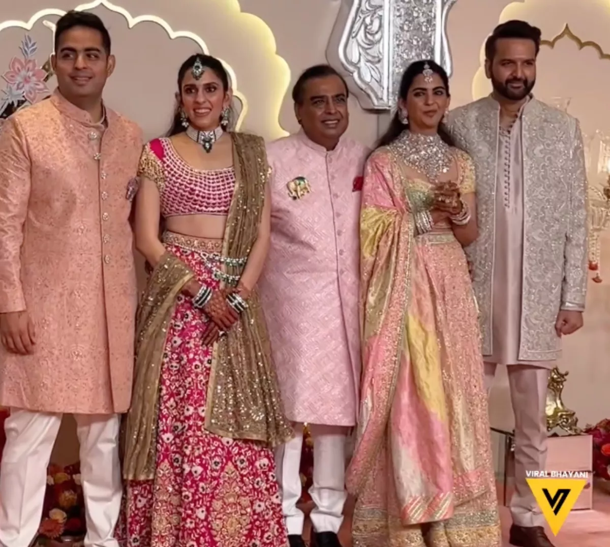 The Ambani clan arrived just on time, and the man of the house, Mukesh Ambani happily posed with his kids and their partners. The badi bahu, Shloka wore a rani pink-toned lehenga, while Isha Ambani picked a soft pink-hued lehenga. Mukesh Ambani was dressed in a soft pink-hued sherwani. On the other hand, Akash looked handsome in a peach-toned sherwani.