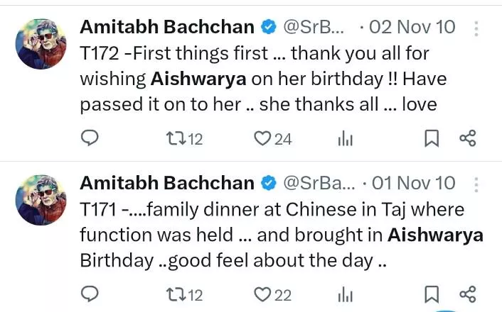 Amitabh Bachchan is quite active on social platforms like X (Previously Twitter) and blogs, but not anywhere he had wished Aishwarya on her 51st birthday. Meanwhile, netizens have dug out his old posts from 2010, wherein he thanked his fans for wishing his bahu, Aishwarya. Not only this, Big B also penned about the low-key celebrations they had for Aishwarya on her 41st birthday. In the follow-up tweet of thanking fans for wishing the actress, Amitabh wrote that there was a family dinner hosted at Taj to ring in Aishwarya's birthday, and he felt good about the day as well.