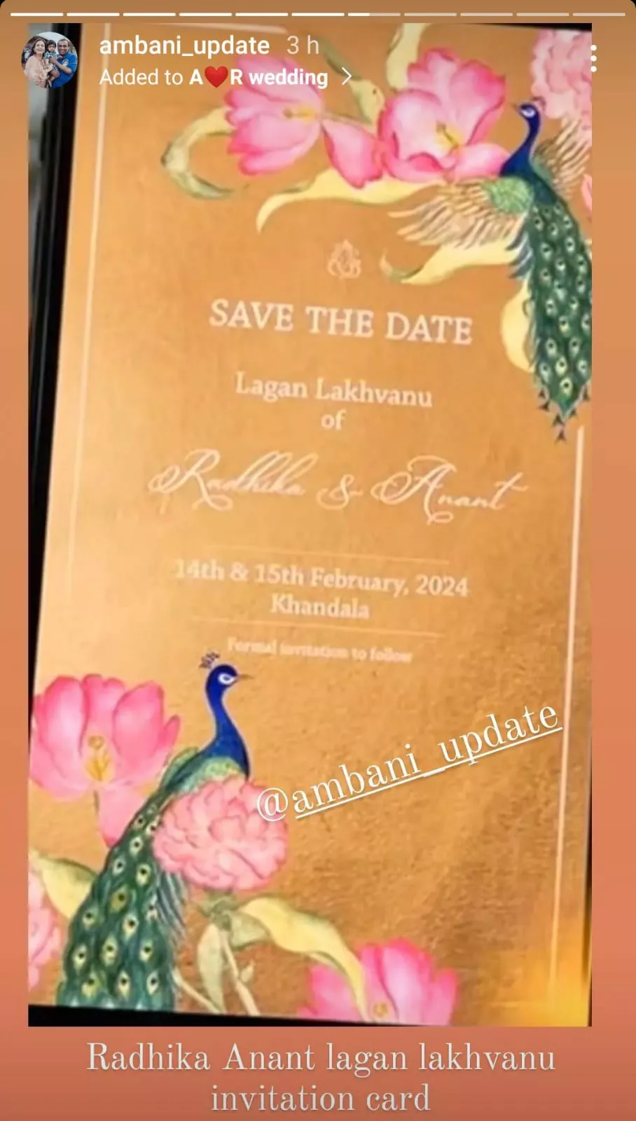 A fan page of Ambanis recently dropped a glimpse of Anant Ambani and Radhika Merchant's 'Save The Date' invitation card for Lagan Lakhvanu. In the photo, we can see the card being made in an orange hue adorned with two motifs of peacock-painting atop flowery branches. Moreover, the design of this 'Save The Date' invitation card for the Lagan Lakhvanu ceremony screamed pure aesthetics. Atop the card, a tiny motif of Lord Ganesha was made. Along with it, the deets about the ceremony were inscribed. Check out the viral photo of Anant and Radhika's 'Save The Date' invitation card: