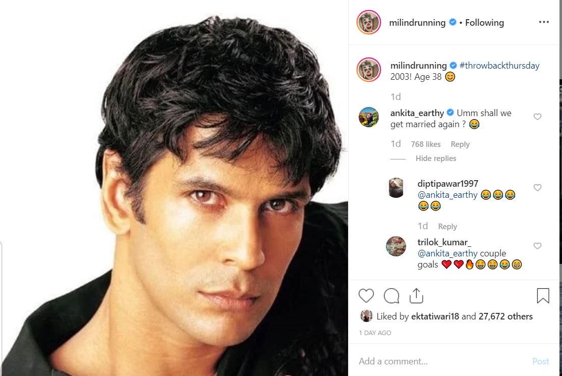Even though the society wasn't welcoming of Milind Soman and Ankita Konwar's relationship, they had chosen to celebrate it and be together against all the odds. The beauty of their relationship is how they turn deaf to what the society says and live their happily ever after by doing what they feel is right. In December 2019, when Milind had posted a throwback picture of himself from his late 30s, Ankita had asked him to marry her again. Just as we continued to drool, his wife, Ankita had commented on the picture, "Umm shall we get married again?" To which, Milind had replied, "Anyday, anywhere", which was backed by hearts and 'happiness always' emojis.