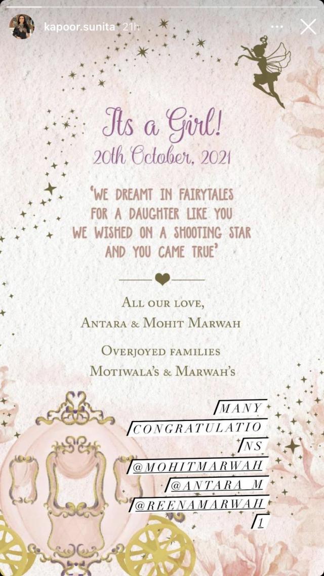 It was Sonam Kapoor’s mother, Sunita Kapoor, who had announced the ‘good news’ of welcoming a new member in the Kapoor family on her IG stories. She had shared a picture note that had mentioned that Mohit Marwah and Antara Motiwala were blessed with a baby girl on October 20, 2021. Sharing the cutesy baby announcement, atop it, she had written: