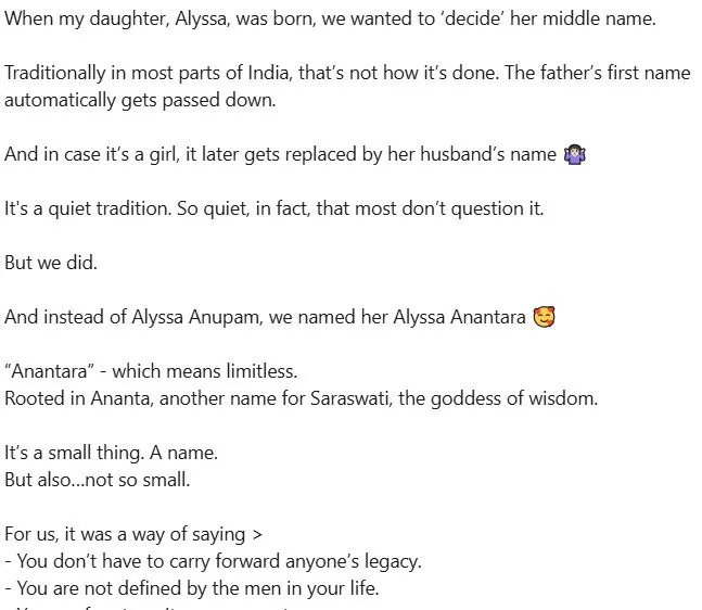 Anupam further added that in a world where girls are identified with the names of the men present in their lives, he and his wife wanted their daughter to start as herself. Anupam concluded his note by stating that it was just a small gesture for their daughter, as they believe in equality in her and in her choices. Well, such a beautiful gesture from the Shaadi.com founder to his daughter is worth praising, and it surely touched the deepest core of hearts.