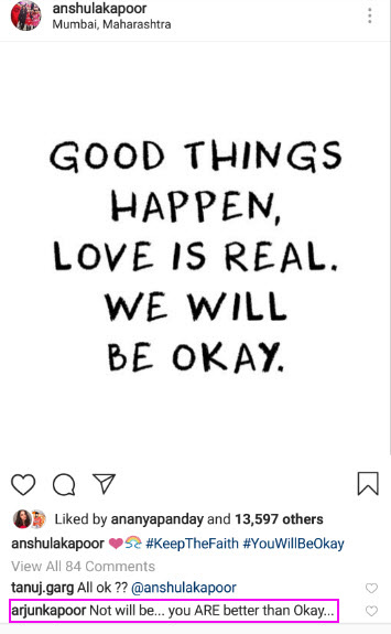 Arjun Kapoor and Anshula Kapoor never shy away from expressing some sibling love for each other on social media. Let us give you an instance of the same. Anshula, usually a very diligent Instagrammer, wasn’t very active on the social networking site for almost a month. Her comeback post on Instagram had a very cryptic meaning hidden behind it. The same could be read as, “Good things happen, love is real. We will be okay”, which was captioned as, “#KeepTheFaith #YouWillBeOkay.” While this made fans and netizens wonder if everything is okay with Anshula, her doting brother, Arjun, posted a single comment which must have warmed millions of heart! The Panipat actor’s comment on his sister’s post could be read as, “Not will be… you ARE better than okay…” Here is a snapshot of the same: