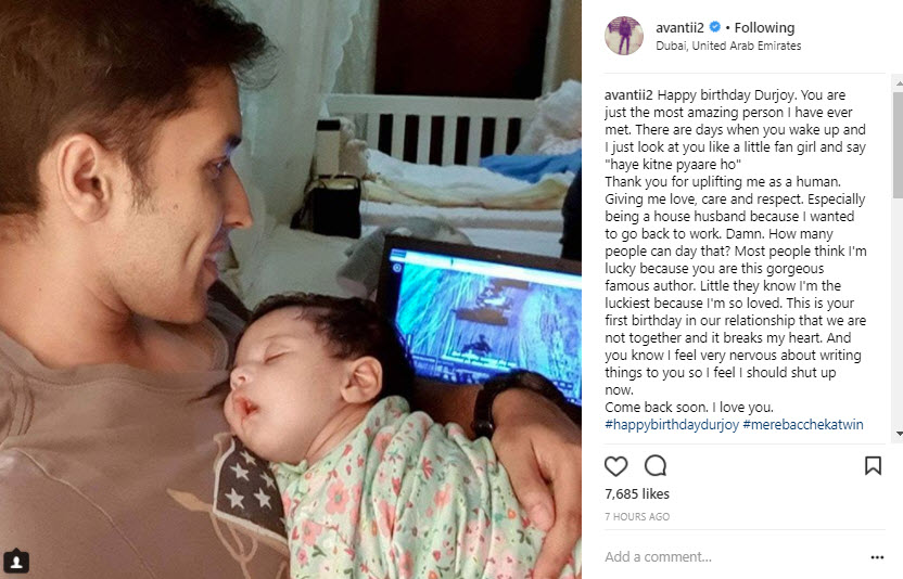 It is Durjoy’s birthday on February 7, 2018, and the proud wifey took to her Instagram handle to wish her hubby. She wrote a special message, which says, “Happy birthday Durjoy. You are just the most amazing person I have ever met. There are days when you wake up and I just look at you like a little fan girl and say "haye kitne pyaare ho" Thank you for uplifting me as a human. Giving me love, care and respect. Especially being a house husband because I wanted to go back to work. Damn. How many people can day that? Most people think I'm lucky because you are this gorgeous famous author. Little they know I'm the luckiest because I'm so loved. This is your first birthday in our relationship that we are not together and it breaks my heart. And you know I feel very nervous about writing things to you so I feel I should shut up now. Come back soon. I love you.#happybirthdaydurjoy #merebacchekatwin”