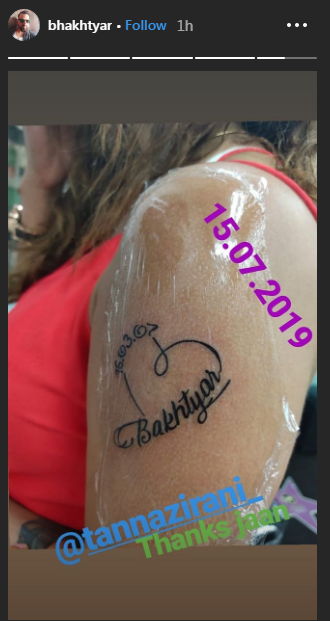 Bakhhtyar Irani and his wife, Tanazz B. Irani are head-over-heels in love with each other and often share quite enviable pictures. The couple is currently holidaying in Phuket and is having a gala time ‘expressing their love' in the most spectacular way. As an expression of love, Tanazz inked her arm with her hubby, Bakhhtyar’s name. Her overwhelmed with happiness hubby took to his Instagram story and proudly flaunted the same with the words ‘Thanks jaan’ and the date ‘15.07.2019’ written atop the picture: