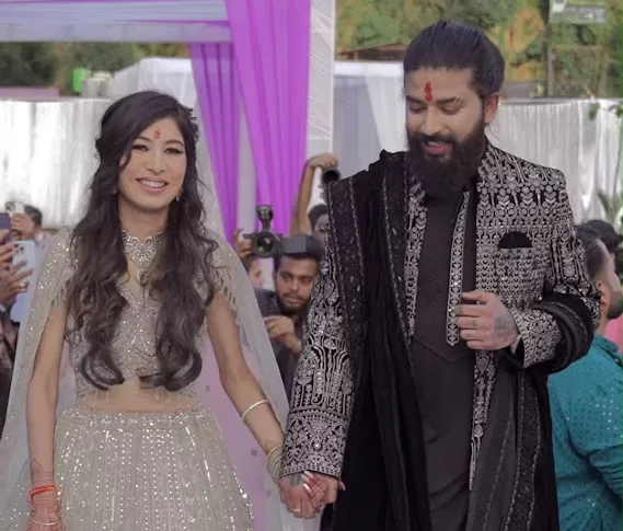 The regal fit also comprised a velvet stole with embroidered bird motifs and white and black threadwork. He completed his look with a watch and a neatly slick back ponytail. His well-groomed beard added stars to his look. Ritika Chauhan, on the other hand, wore a dazzling champagne-coloured lehenga with intricate sequin and beadwork throughout the lehenga. The voluminous skirt gave Ritika a princess-like charm.