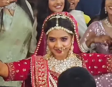 Recently, a video clip from a wedding has taken social media by storm, showing a bride happily dancing at her wedding. She was dolled up in a red lehenga with golden sequin and zari work, paired with a matching sheer dupatta over her head, accessorised by stone necklaces, matching earrings, a matha patti, mang tikka, and red chooda. As she walked, the music and celebrations made her so happy that she started dancing and enjoying her big day.