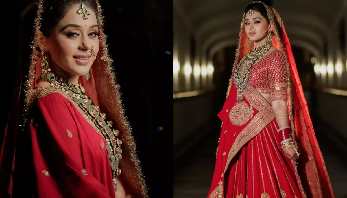 The bride, Vibhuti wore Sabyasachi Mukherjee's lehenga for her wedding day. The red lehenga with golden zardosi work on the hem and butti-work choli made her look just on point. She styled her outfit with double dupattas. One with kiran border was pinned over hed head, while the other one was secured over her shoulder.