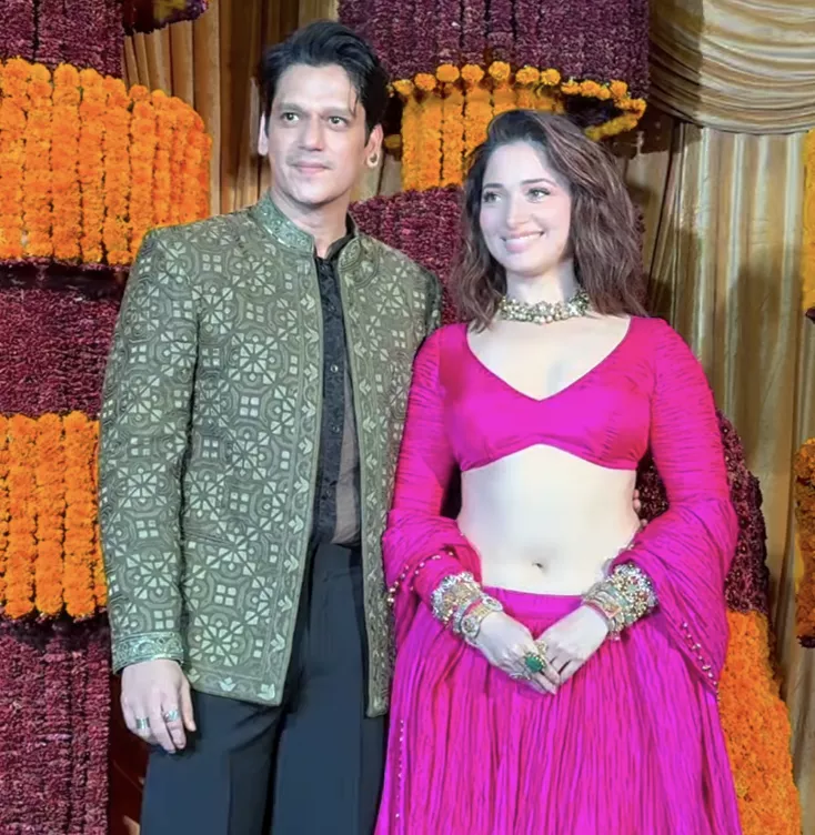 Tamannaah Bhatia and Vijay Verma , a fan favorite couple in B-town, were papped making an appearance at Ramesh Taurani's Diwali bash. Tamannaah looked drop-dead gorgeous as she flaunted her curves in a rani pink lehenga for the occasion. Her beau, Vijay Verma looked dapper in a jacket and trousers.