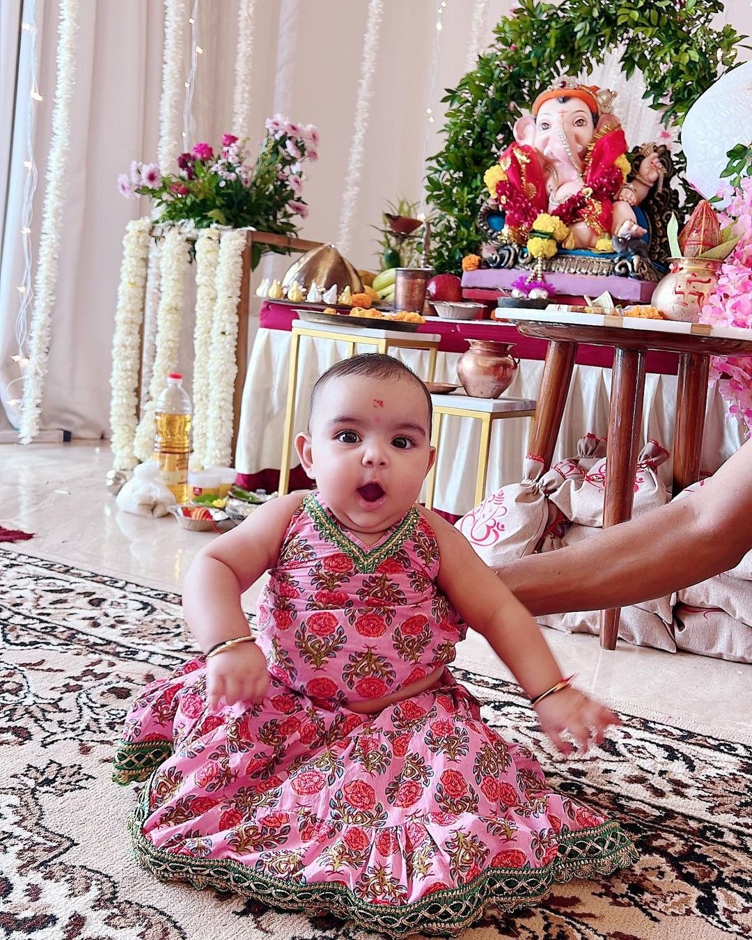 For Ganpati aagman, Debina decked up her baby girl in a floral pink-coloured lehenga with green-hued borders. Lianna looked adorable as she posed with her Gannu bhaiya. The Ganpati pandal was decked up with green leaf garland and white flowers.
