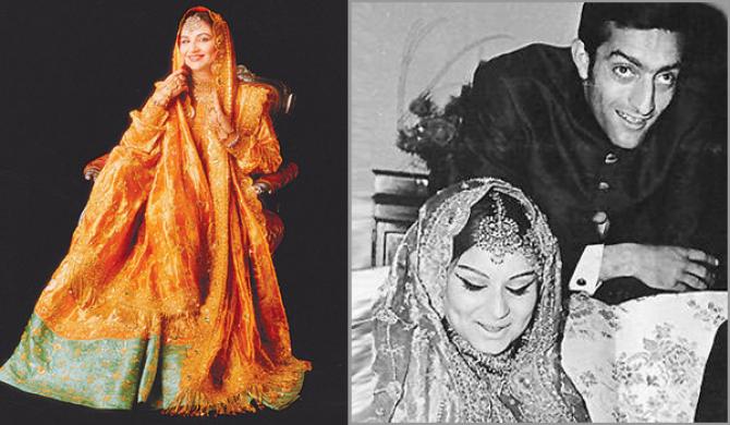 Let us begin with the royal bride, Sharmila Tagore. She broke her fans' hearts when she got married to cricketer and the Nawab of Pataudi, Mansoor Ali Khan Pataudi. She wore a stunning golden coloured gharara for her nikah. It was the same outfit that her daughter-in-law, Kareena Kapoor, wore on her D-day. Sharmila wore stunning bridal jewellery that not only matched with her outfit, but also added a royal charm to her look. Also Read: Unconventional Love Story Of Bengali Beauty Sharmila Tagore And Charming Mansoor Ali Khan Pataudi