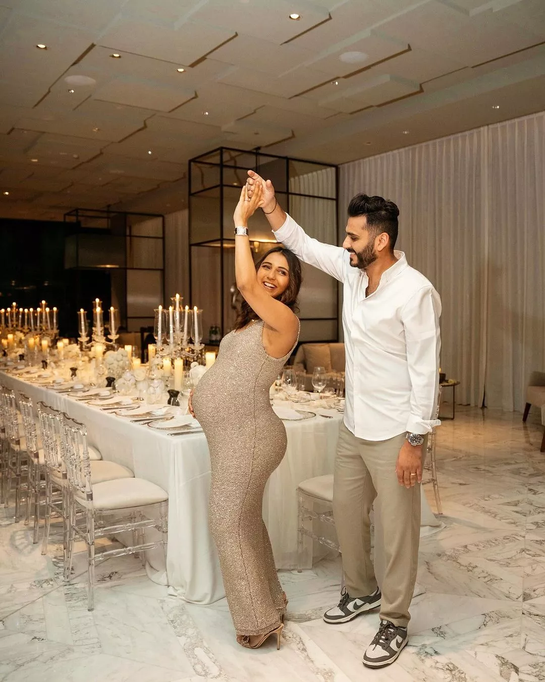 Recently, Masoom shared glimpses of her dreamy baby shower bash. The influencer was dressed up in a bejewelled sparkly rose gold bodycon dress. The mom-to-be looked super gorgeous as she flaunted her fully-grown baby bump. In the first photo, her husband, Shalin was dancing with her and the couple looked super happy.