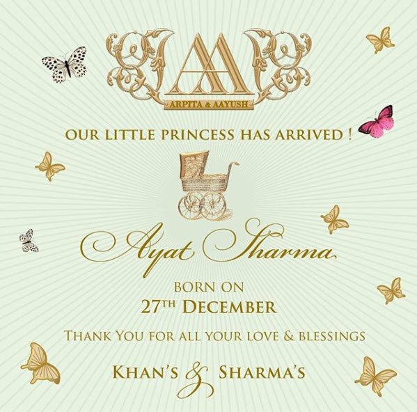 Arpita Khan Sharma and Aayush Sharma had released an official statement to announce the birth of their little angel. The same could be read as “With great joy and immense pleasure, we announce that we have been blessed with a baby girl. On this joyous occasion, we would like to thank our family, friends and all our well-wishers for their unconditional support. We also extended a humble thank you to our media friends and to our fans for their constant love and support. This journey couldn’t have been complete without you all. Lots of Love, Aayush, Arpita & Ahil/ Khan & Sharma Family.”