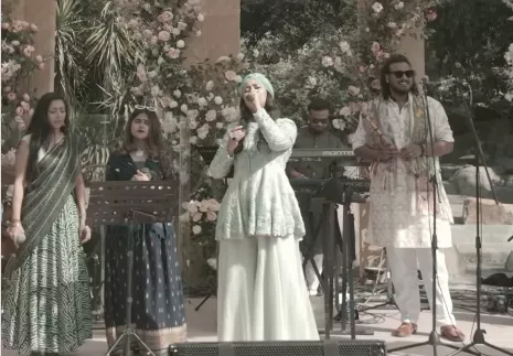 Recently, Harshdeep Kaur took to her IG handle to share a glimpse of the intimate yet grand wedding of Harkirat and Tejveer. The Ikk Tara singer was seen on the stage, performing soulful melodies dedicated to the newlywed couple. Harshdeep stunned in a pastel green intricately embroidered sharara ensemble. She kept her hair open, donning her signature-style matching headscarf, adorned with a jewel at the front, making her look every bit as regal as her voice sounded.