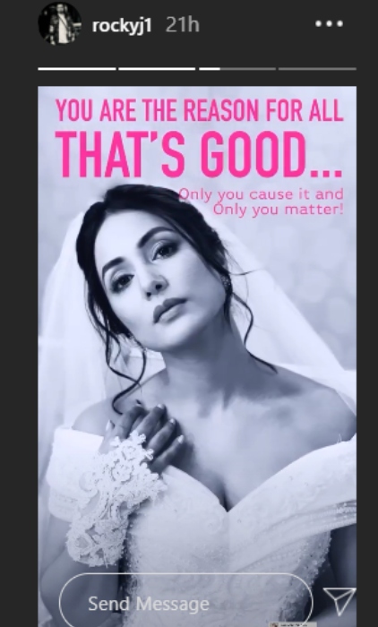 Hina and Rocky together are goals. The way these lovebirds hype each other and never shy away from showering love on each other through their respective social media handles is just adorable and fans absolutely love their social media PDA. On September 15, 2020, Rocky Jaiswal had taken to his IG handle and had shared a beautiful picture of Hina Khan. The picture was a still from a music video, Humko Tum Mil Gaye. Rocky had captioned it as "You are the reason for all that's good. Only you cause it and only you matter."