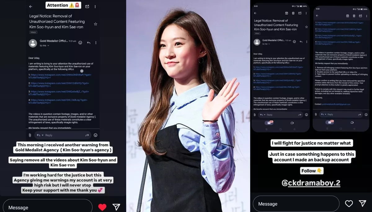 An influencer, whose IG handle goes by the name, "@ckdramaboy" shared a series of screenshots from a legal mail from Kim Soo-Hyun's agency, Gold Medalist. As per the photos, the agency has asked for the removal of the content featuring unauthorised use of the images of the actor. In the shared screengrabs, it was clearly stated by the influencer that he shared it not for the sake to harm anyone, but for transparency. He also stated that his K-drama fan page was at risk of being taken down. He further mentioned that he would keep fighting for the justice of Kim Sae-Ron's demise.