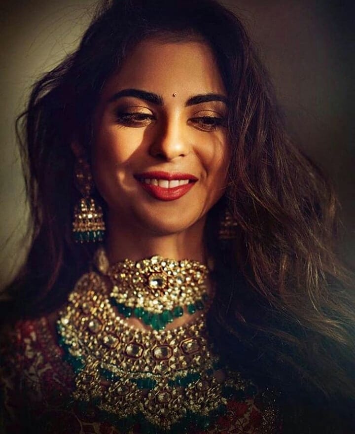 “Isha Ambani @_iiishmagish for her Graha Shanti Pooja in a custom hand-painted, hand-embroidered tilla-work lehenga and antique bandhej dupatta. The outfit is a part of the India Revival Project by Sabyasachi. Her look is accessorised with a necklace and earring set featuring uncut Syndicate diamonds and Zambian emeralds. Jewellery Courtesy: Sabyasachi Heritage Jewelry @sabyasachijewelry.”