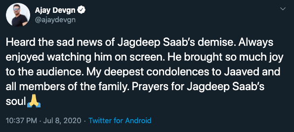The veteran actor, Jagdeep Jaffery had worked in many mega-hits such as Purana Mandir, 3D Saamri, Sholay, Andaaz Apna Apna, and many more. The legendary comedian, who has given stars like Jaaved Jaffery and Naved Jaffery to the Bollywood industry had bid farewell to all of us on July 8, 2020. According to a report from PTI, famous producer, Mahmood Ali has revealed that Jagdeep Jaffery has breathed his last after some old-age related health problems. He said, “He passed away at 8: 30 pm at his residence in Bandra. He was not keeping well due to age-related issues.” After hearing about the heartbreaking news of the legendary actor’s demise, the whole Bollywood fraternity has come together on social media to shower their love and respects on the late actor. While some are appreciating his comic timing, some are praising the kind of person he was in reality. Here are some of the tweets from celebrities.