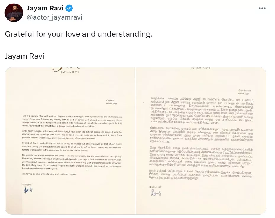 Taking to his X handle (formerly Twitter), Jayam Ravi posted two pictures of the statement in English and Tamil and announced that he had parted ways with his wife, Aarti. The actor, who ended his 15 years of marriage, called it a mutual decision. His statement can be read as: