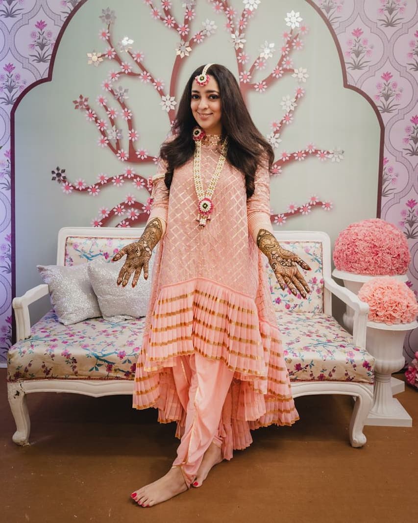 On August 28, 2020, Nidhi celebrated her mehendi ceremony as she was all set to get engaged to beau, Binoy. Noted Bollywood mehendi artist, Veena Nagda took to her IG handle and shared beautiful pictures of the mehendi ceremony. Nidhi looked gorgeous in a peach-coloured outfit and complemented her look with floral jewellery. Actress, Dipika Kakar and Sara Ali Khan too graced Nidhi’s mehendi function. Take a look!