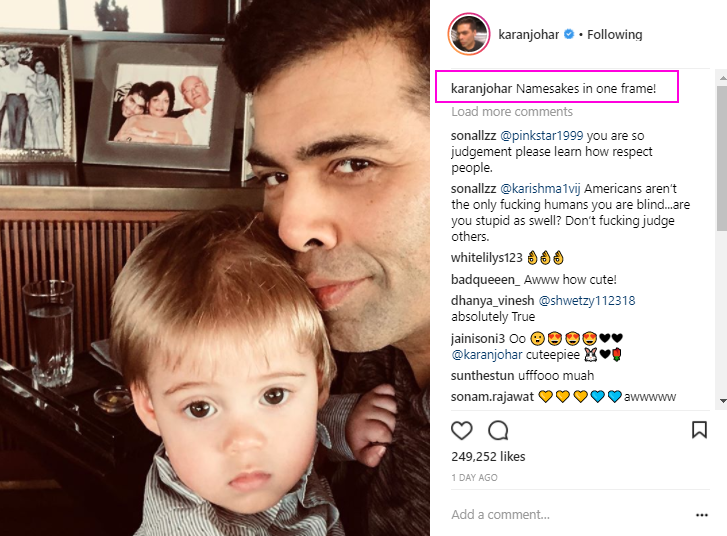 On April 29, 2018, Karan shared a photo posing with his golden-haired son Yash, and their picture is shot against the backdrop which has Karan's pictures with his parents, Yash Johar and Hiroo Johar. Karan captioned the picture as, "Namesakes in one frame!" And on April 30, 2018, the doting father, Karan shared the picture of his darling daughter, Roohi in which is seen all smiles showing off her two teeth. Wearing a white frock with black dots over it, Roohi surely knows how to pose for a camera, just like her father. Karan captioned it as, "My Roohi".