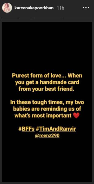 The lockdown has made us stay at home, away from our friends and families and to ensure safety, everyone's advised to follow social distancing. While we all are missing our friends and families, Taimur Ali Khan had received a handmade card from his BFF, Ranvir, which exuded the purest form of love. Kareena Kapoor Khan had posted pictures of the card on her IG stories and had written, "Purest form of love...when you get a handmade card from your best friend. In these tough times, my two babies are reminding us of what is most important love. BFFs Tim and Ranvir."