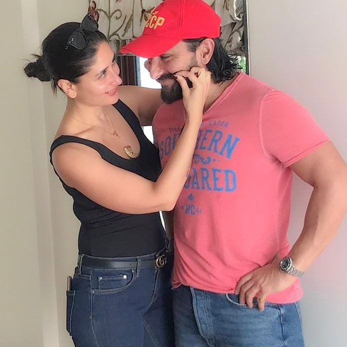 It was only yesterday (May 20, 2019), when paps clicked most of the astonishing couple, Kareena Kapoor Khan and Saif Ali Khan with celebrated ‘sports science and nutrition expert’, Rujuta Diwekar for a Facebook Live. Kareena had looked uber cool in a black tank top, tight-fit denim, a heavy pendant, hair tied in a bun with glasses on her forehead, while hubby Saif, had complemented his beautiful wife in a peach tee, denim and a cap. However, what was extremely adorable was the way Kareena played with her hubby, Saif’s moustache! Take a look at the same below:
