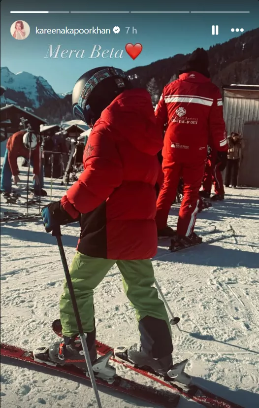 On December 29, 2024, the proud mom, Kareena took to her IG handle to share delightful moments from their skiing escapades. Taimur, affectionately called Tim Tim, looked every bit the budding skier in his full skiing gear. Captured from behind, Taimur stood confidently with ski poles in hand, ready to conquer the snowy slopes. Kareena captioned the image with a heartfelt, "Mera Beta".