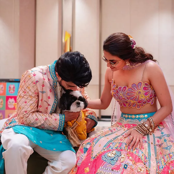 The pink tulle dupatta completed Keerthy's look, it had an acrylic border and pearls all over. Antony on the other hand wore a printed short open jacket intricately embroidered with golden metallic accents, pearls and acrylic mirrors in a custom print with motifs from their love story. He paired his outfit with an ombre ivory to blue kurta and ivory pants.