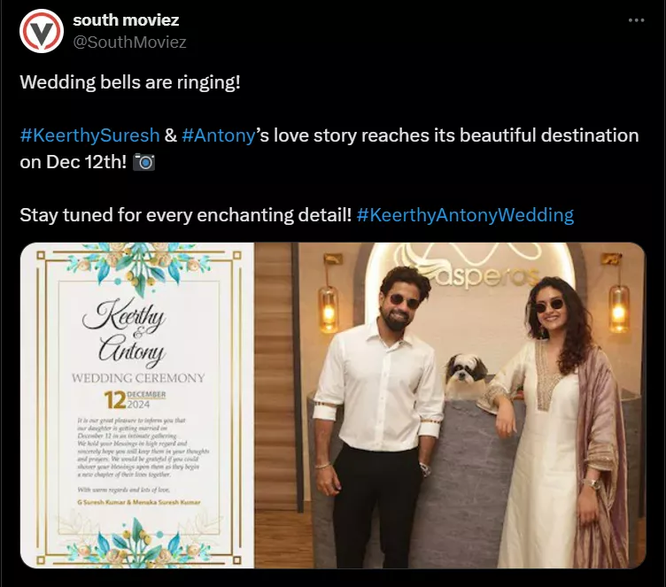 As soon as Keerthy and Antony’s wedding invite got leaked on social media, it took the internet by storm. The invite was signed by Keerthy’s parents, G Suresh Kumar and Menaka Suresh, who confirmed the date and described the wedding as an intimate gathering of close family and friends. The note in the invite read:
