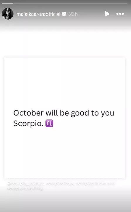 After 20 days of Anil Mehta’s death, Malaika returned to social media and shared her first post. Taking to her IG stories, she shared a note that can be read as, “October will be good to you. Scorpio.” For the uninitiated, October 23 is Malaika Arora’s birthday, and the actress is hoping for some happiness amid the personal loss she recently incurred.