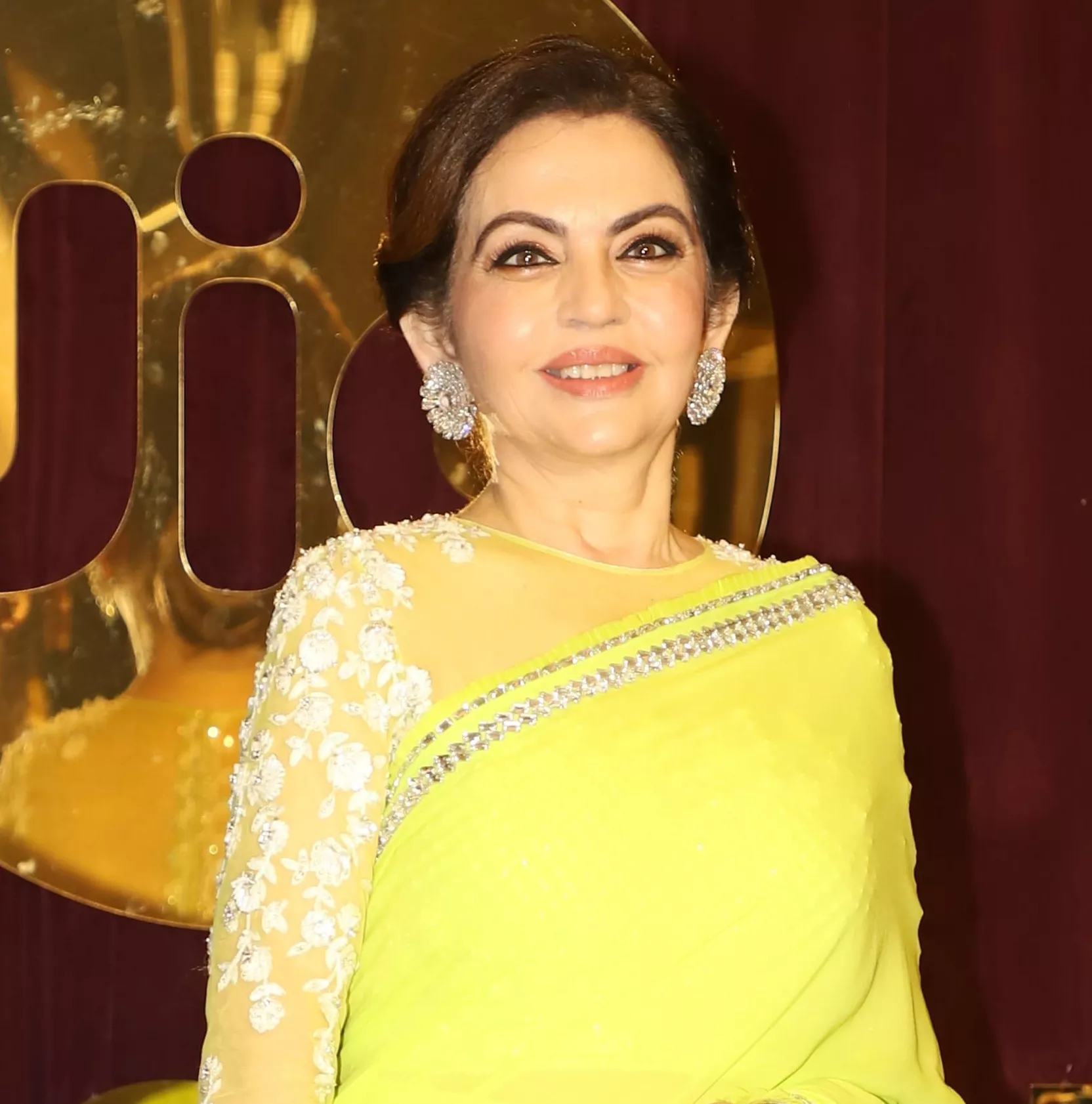 Nita Ambani embraced a pop of colour moment as she graced the event in a bright, neon green saree with a stone-encrusted, silver border. She balanced the look with a blouse featuring white floral embroidery. To complete the look, Nita accessorised with a pair of statement diamond earrings and a unique ring spanning the length of her ring finger. Nita also carried with her a pale green Hermes bag.