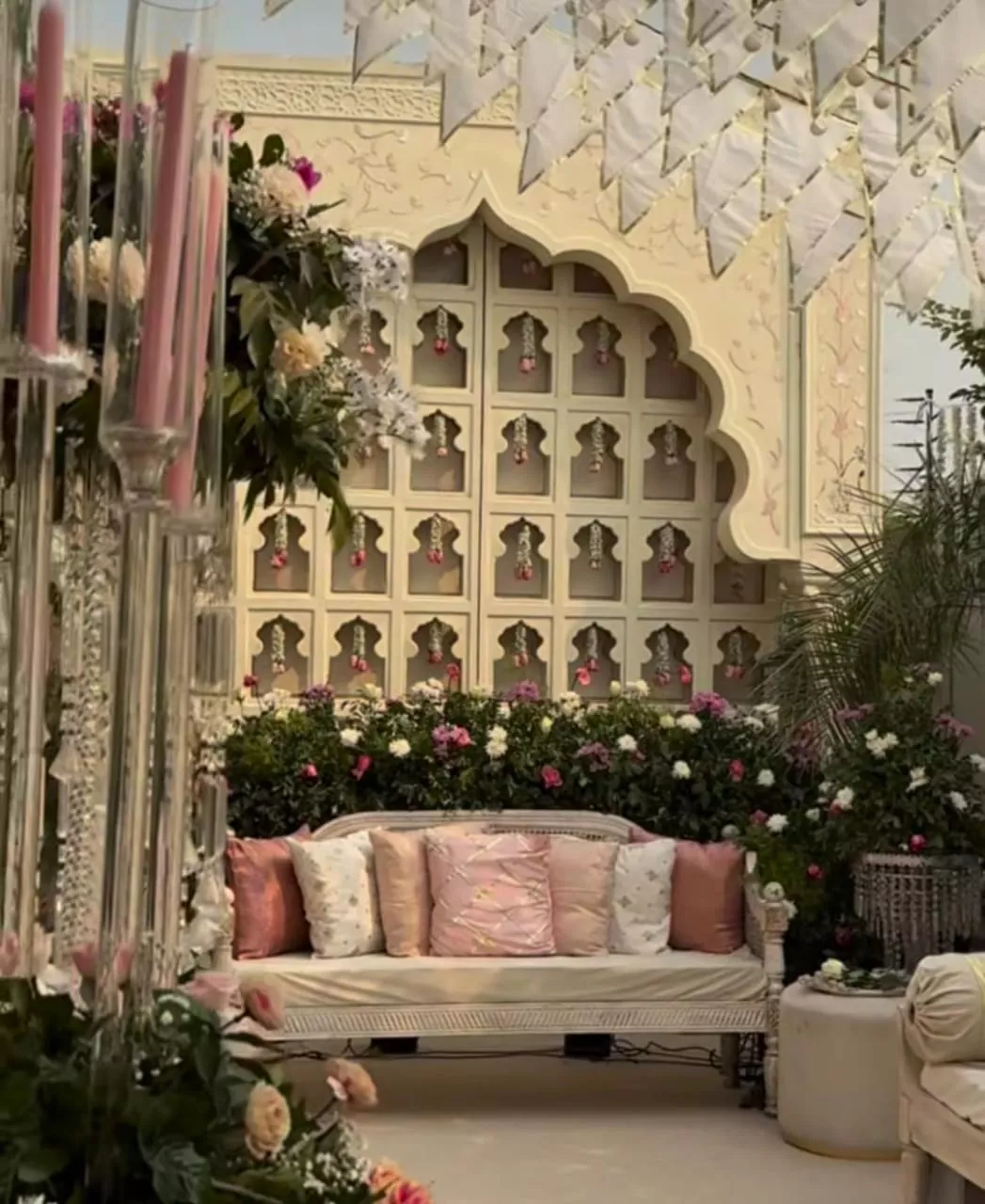 Mawra Hocane and Ameer Gilani's nikah was designed by Amahle Events by Amna. Recently, the official IG page of this event organiser dropped a clip featuring inside glimpses of the actress' wedding. In the clip, we can see a huge mirrored hoarding, wherein the bride and groom's names were written along with their wedding date and a welcome message. The entire place was decorated with flower strings, such as mugra and pink-white roses and each of the corners screamed elegance. The muted-toned seating places perfectly complemented the entire floral decor of the wedding venue.