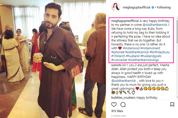 On March 15, 2018, it is Siddhant’s 35 birthday, and his partner-in-crime took her Instagram handle to wish her hubby. Megha Gupta posted a picture of him, with the caption, “A very happy birthday to my partner in crime @siddhantkarnick!! We have come a long way Bubs, from refusing to hold my bag to then holding it n perfecting the pose. I have no idea about the silliness that we do together. But honestly, there is no one I’d rather do it with”