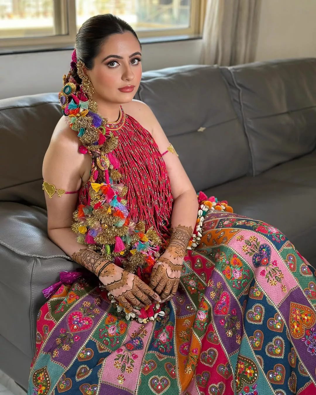 Ankita Ajbani donned a two-piece for her mehendi ceremony. The top was made of silk and was red-hued with prints. The backless bralette-styled top had a tie-up detailing at the back, while the main attraction was made in the front of the top, which had fringed detailing in red-hue, and in the hemlines there was tassel detailing, made in Parandi style, and the top was enough to bring the Bohemian touch. She teamed her dramatic top with a multi-hued skirt, which had mixed-toned box detailing filled with different prints.