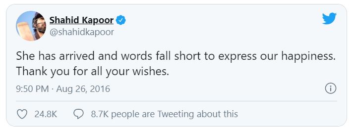 Remember how Shahid Kapoor had confirmed the news of his wife, Mira Rajput Kapoor’s pregnancy? A little recap of the time when during the promotions of Udta Punjab in April 2016, a journalist had asked Shahid indirectly about the speculations regarding Mira’s pregnancy and he had retorted, “Haan main baap banne wala hoon. Kya kar lega tu?” And in August 2016, Shahid had announced the arrival of his little angel and expressing his feelings on becoming a father, he had tweeted, “She has arrived and words fall short to express our happiness. Thank you for all your wishes.”