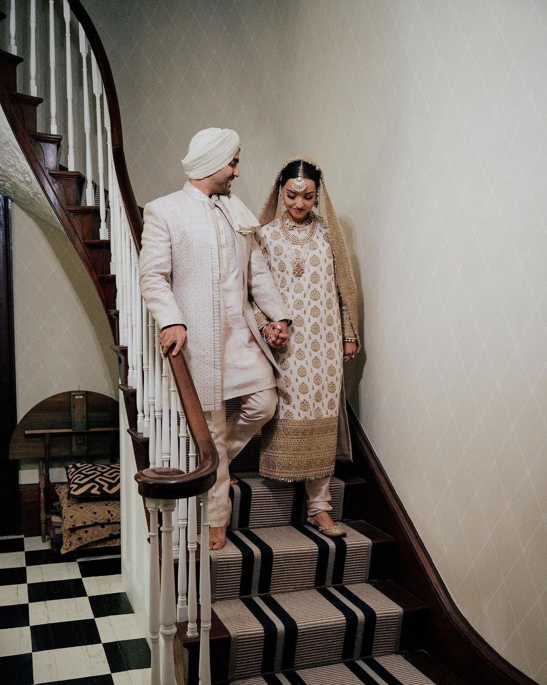 The bride's calf-length cream-toned kurta featured a close neck with butti-work all over it. She styled it with matching pants and a dupatta pinned over her head.
