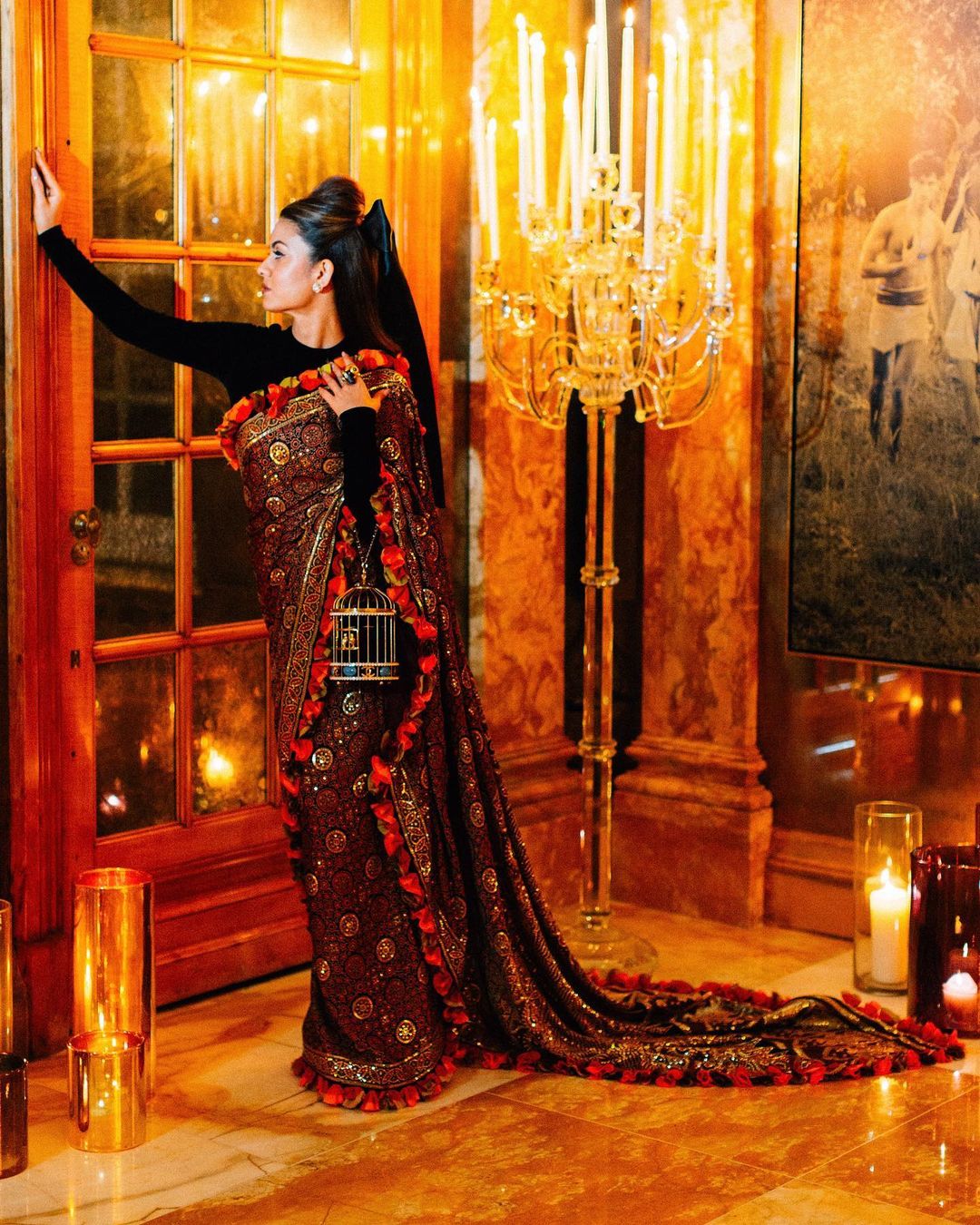 Natasha Poonawala is known for her extraordinary life. A glimpse of which we saw on her IG handle. For the Diwali celebration, we had spotted her donning a pretty black saree with golden embroidery and red tasselled detailing from the designer duo, Abu Jani and Sandeep Khosla's collection. She had styled it with a full-sleeved black blouse.