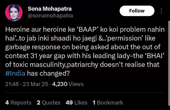 After Salman Khan addressed the age gap issue, Sona Mohapatra took to her X account and shared her dismay with the comment. The singer called Salman out for his remarks while defending the 31-year age gap with Rashmika. Salman said that if Rashmika or her father has no issue with it, then why do others have a problem with it? This statement didn't come across as Salman had hoped. Sona on March 23, 2025, stated: