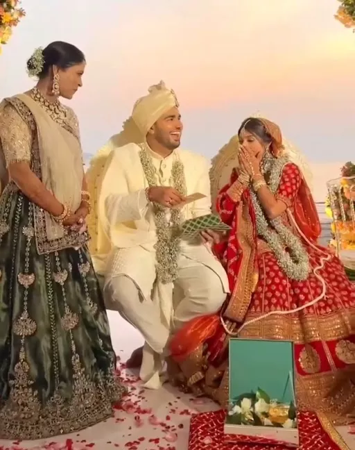 The bride completed her look with glamorous makeup and a sheer dupatta. She accessorised her look with a diamond necklace, stacked kangans, and a mang teeka. The bride's mother came to the pedestal and gave the newlywed an envelope. As the groom opened it, a ticket, which was for Coldplay's concert tickets, emerged from the envelope.