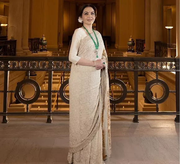 Nita Ambani chose a chikankari saree from Anamika Khanna's shelves for the special occasion. The ivory-coloured saree featured intricate embroidery and delicate lace detailing. The fabric draped gracefully, adding a regal and elegant aura to Nita's appearance. She paired the beautiful saree with a matching three-quarter sleeve blouse, which gave a modest and sophisticated allure to the ensemble.