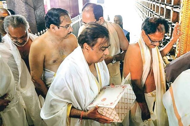 Later, Mukesh Ambani along with his youngest son, Anant Ambani took a day off from the wedding preparations and went to temples to seek blessings for Isha and Anand. According to the reports, Mukesh Ambani and Anant Ambani went to Sri Venkateswara Temple, Tirupati, Tirumala in Andhra Pradesh. After seeking blessings and placing the invitation at the deity's feet, the father-son duo travelled to the Guruvayoor temple in Kerala via his private chopper.