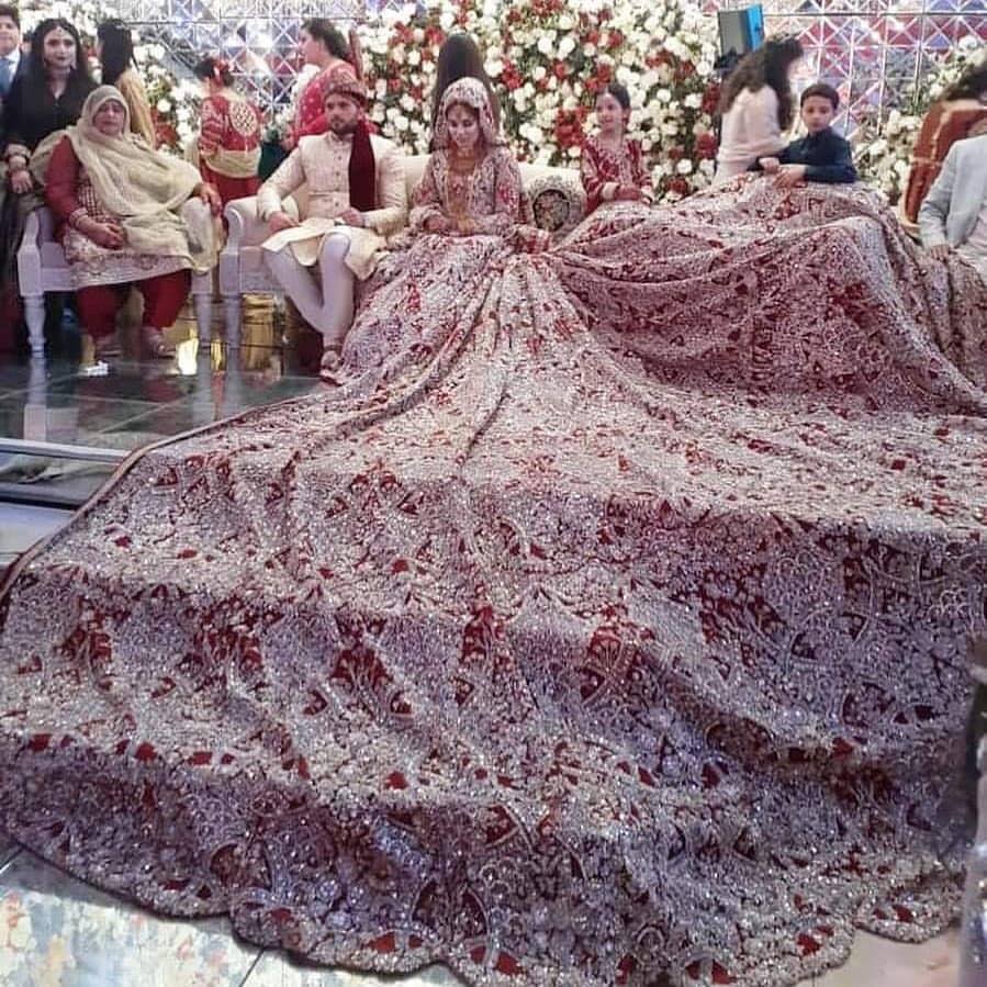 Over the years, wedding fashion has evolved, and now, brides are opting for their dream ensembles. They are ditching the usual lehengas and wearing what they love the most. From pretty pastels to shararas and sarees, they are wearing what they really like. And sometimes just like Priyanka Chopra Jonas, they prefer the trail of the dress to be very long. Recently, we spotted a bride from across the borders, who wore a giant red lehenga for her D-day, and it left everyone amazed.