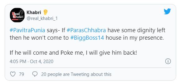 Pavitra and Paras were romantically involved and dating some years ago. However, the two had ended their relationship and the reason was unknown, until now. Owing to the new theme of Bigg Boss 14, it is expected that Paras Chhabra and Mahira Sharma might enter the house for a special task, and now, Pavitra has reacted to these speculations and has also warned Paras about the same. According to a Twitter handle, Khabri, Pavitra doesn’t want Paras to enter the show during her stay in the house. Tweeting about Pavitra’s warning, Khabri wrote, “If Paras Chhabra has some dignity left then he won't come to Bigg Boss14 house in my presence. If he will come and poke me, I will give him back!”