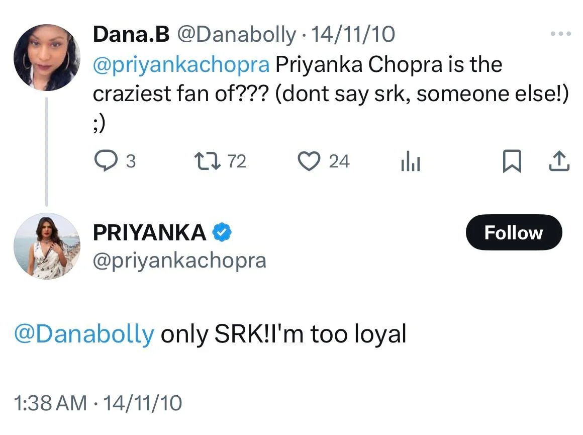 Recently, a bunch of Priyanka Chopra's old tweets referring to Shah Rukh Khan and responding to the actor's fan pages were posted on Reddit. Many of the tweets seemed to have been taken from Q&A sessions, with the actress satisfying fans' curiosity. One user asked Priyanka to name any celebrity she was crazy for besides Shah Rukh. Well, the Dostana star responded, "Only SRK! I'm too loyal."